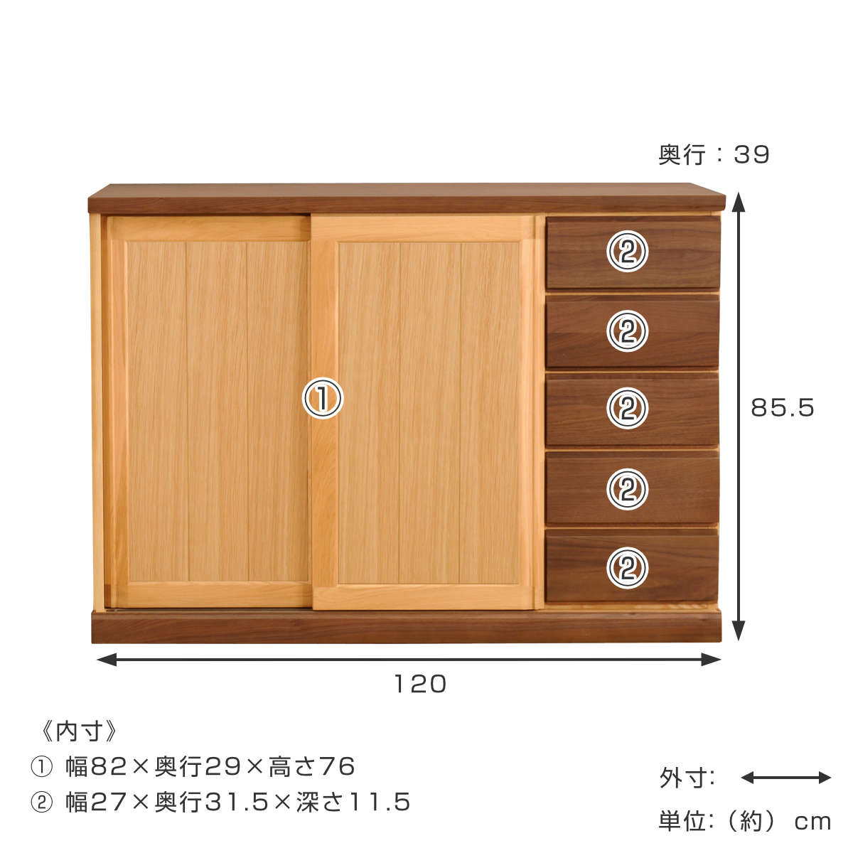 サイドボード 板引き戸 引出し5段 天然木 日本製 幅120cm ( 送料無料 収納棚 窓下 キッチン キッチンカウンター 完成品 収納 キッチン収納 木製 ウォールナット オーク 国産 おしゃれ )